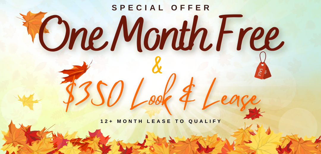 Sign a 12+ lease on select apartment homes and get 1 MONTH FREE RENT + an extra $350 Look & Lease bonus when you move in by November 15th! Hurry—these fall savings won’t last! 🍁